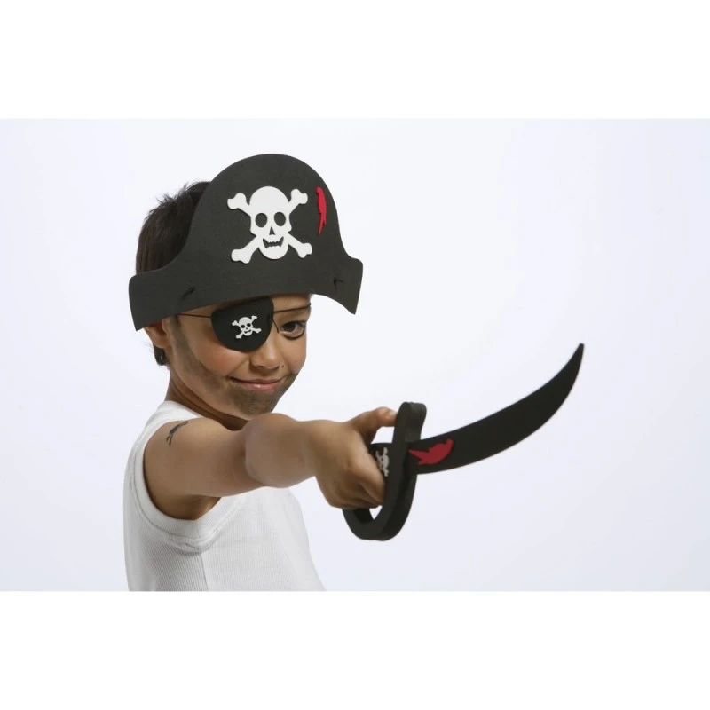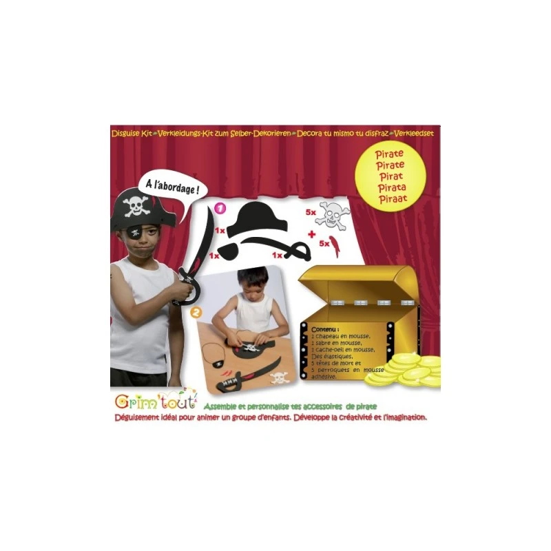 Ce kit contient : 1 chapeau + 1 sabre + 1 cache-oeil + des élastiques + des têtes de mort et perroquets en mousse adhésive