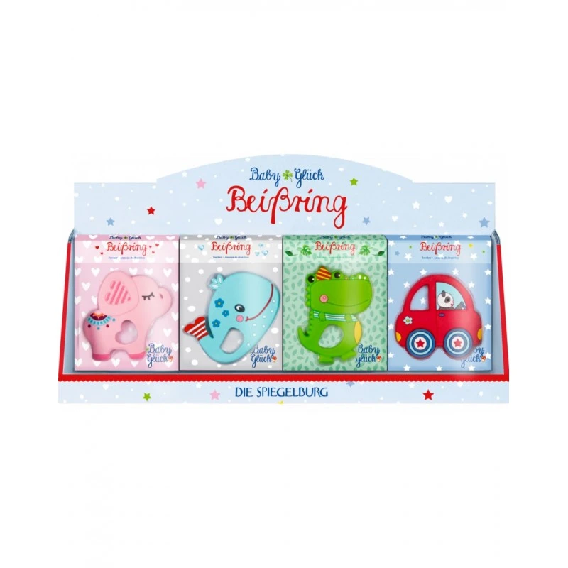 Anneau de dentition proposé parmi un choix de 4 petits personnages : éléphant rose, crocodile vert, voiture rouge et baleine bleue.