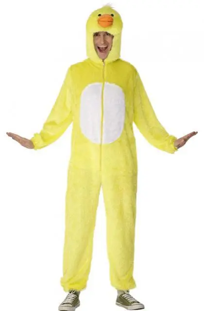 Combinaison de déguisement canard avec cagoule comportant les yeux et bec de canard jaune.