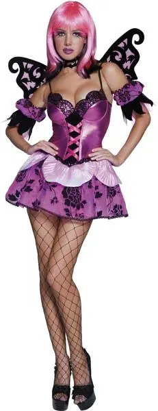 Ce déguisement se compose d’une robe rose avec des ailes noires. Des manches et d’un noeud noir toujours sur ces mêmes tons.