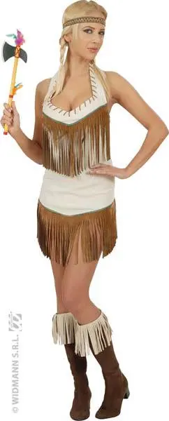 Ce costume se compose d’une robe de belle qualité de couleur crème et marron avec des franges et de son serre tête.