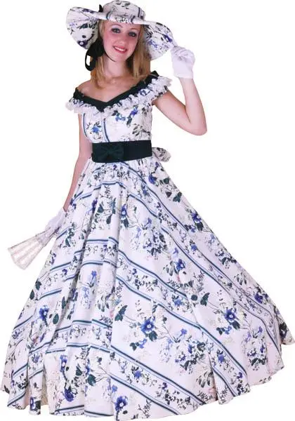 Superbe déguisement Belle du Sud. Ce costume se compose d’une robe avec son jupon ainsi que de sa coiffe. Existe en 2 tailles.