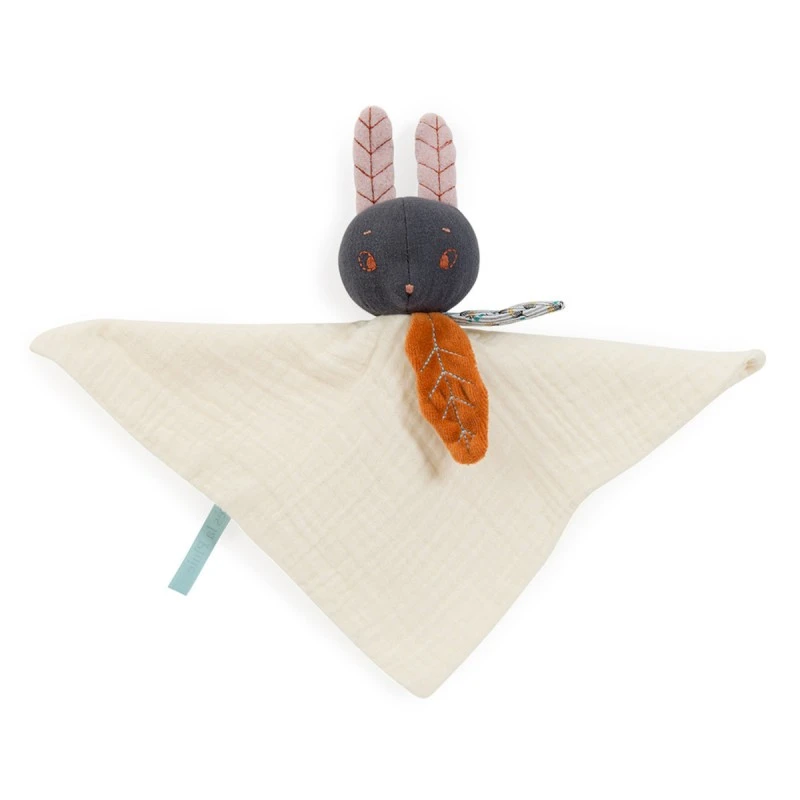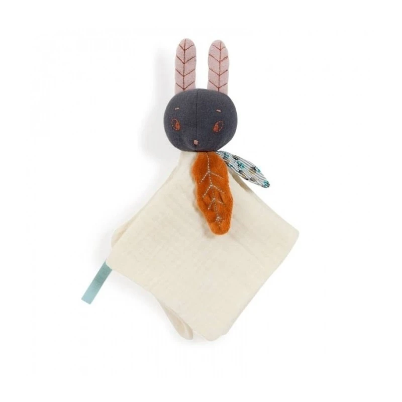 Doudou Lune en lange de coton biologique qui porte à son cou deux feuilles d’automne avec un minois brodé de fil cuivré et ses oreilles en polaire toutes douces pour se glisser auprès de bébé.