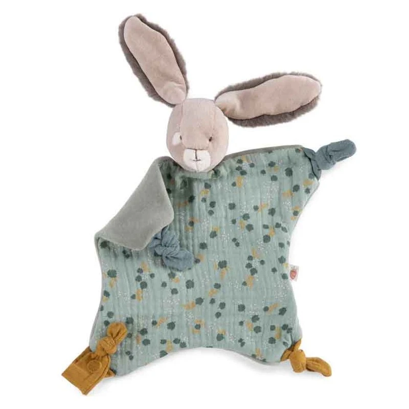 Découvrez le doudou lapin de la collection Trois Petits Lapins de Moulin Roty, un joli doudou plat et carré, facile à saisir par les petites mains de bébé. Un lapinou qui apportera du réconfort et de la douceur à votre bébé.