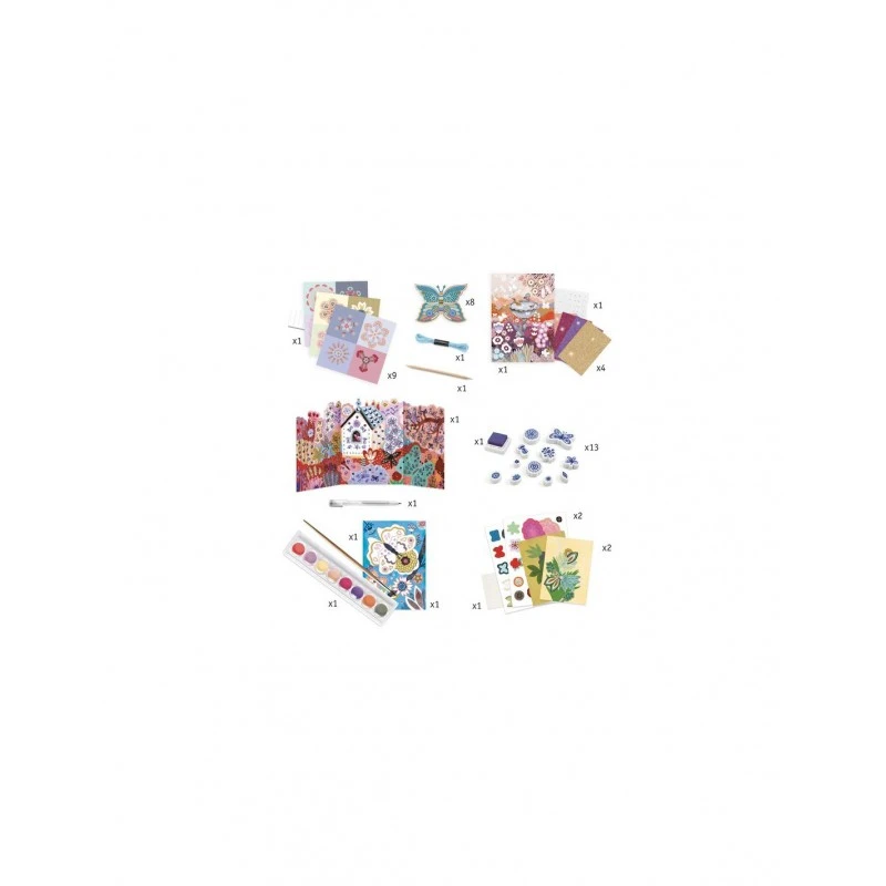 Ce coffret renferme 6 activités avec de la peinture, des collages, des cartes à gratter, des tampons, des saynètes 3D et des fleurs à créer.