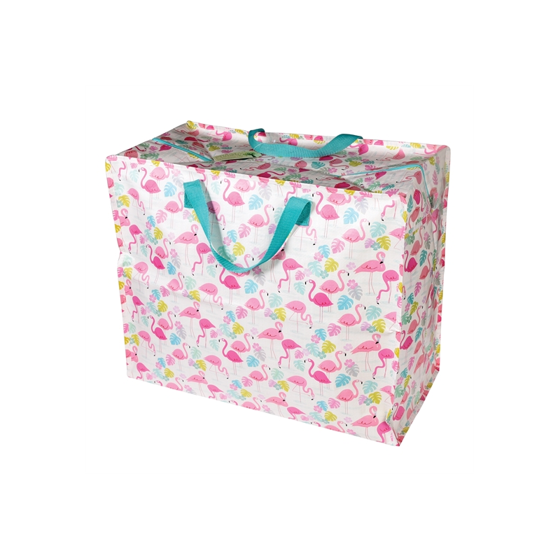 Grand sac de rangement Jumbo “Flamant Rose” décoré de ravissants flamants roses. Ce sac très solide est fabriqué à partir de bouteilles en plastique recyclées dont les poignées solides sont fabriquées en nylon. Se plie facilement pour faciliter le rangement d’objets divers, il permet de ranger de gros volumes et supporte de lourdes charges.