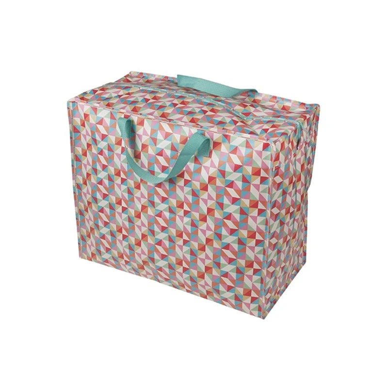 Grand sac de rangement Jumbo décoré de formes géométriques colorées. Ce sac très solide est fabriqué à partir de bouteilles en plastique recyclées dont les poignées solides sont fabriquées en nylon. Se plie facilement pour faciliter le rangement d’objets divers, il permet de ranger de gros volumes et supporte de lourdes charges.