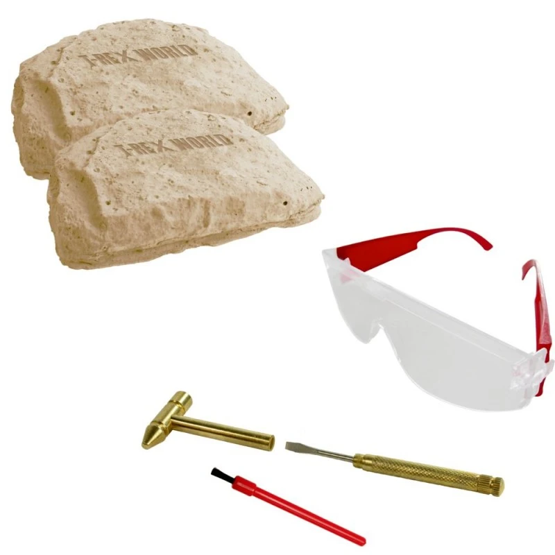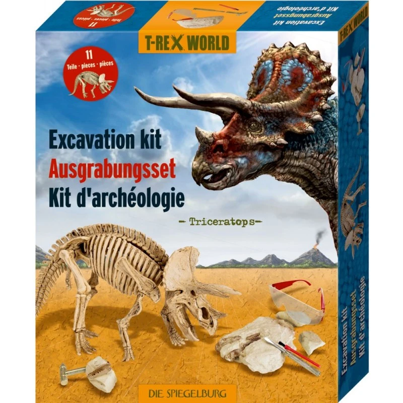 Ce kit de fouilles archéologiques Triceratops permet de dégager les ossements de dinosaure de la roche comme un veritable chercheur de dinosaures (paléontologue). Il convient d’être méticuleux lors des travaux de fouilles afin de ne pas abîmer la trouvaille préhistorique. Les os peuvent être assemblés par la suite pour former un squelette de Triceratops.
