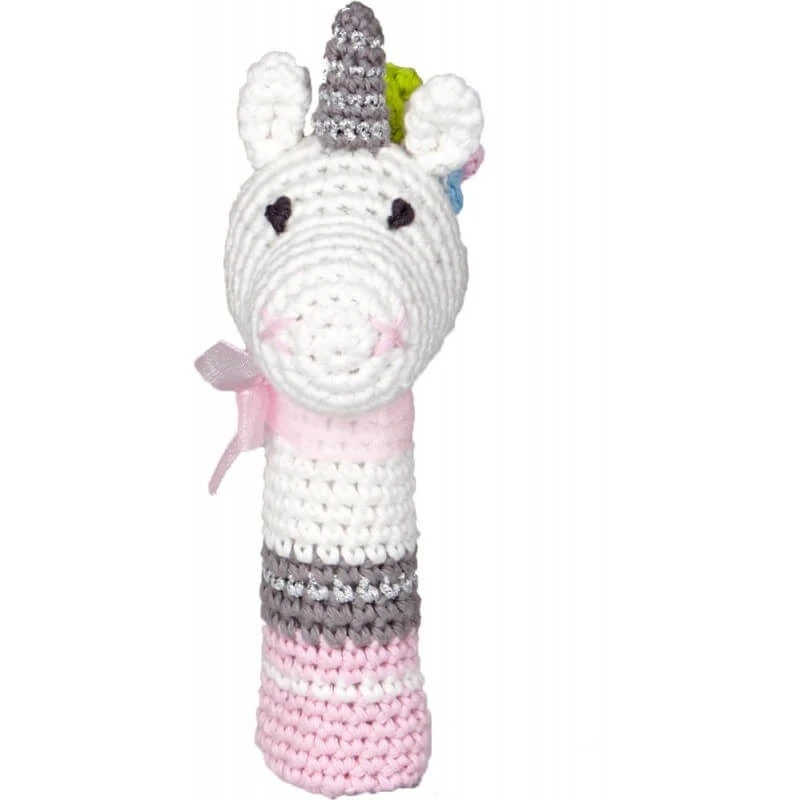 Mini hochet Licorne réalisé en tricot, cadeau idéal pour une naissance.