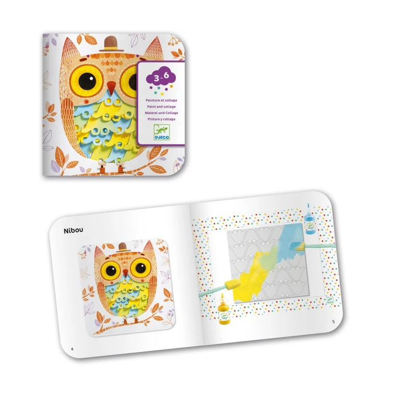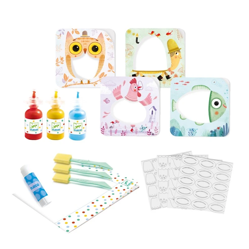 Contenu : 4 planches prédécoupées à peindre, 4 cartes animaux à décorer, 3 bouteilles de gouache (bleu, jaune et rouge), 1 tube de colle, 3 pinceaux en mousse, 1 protection de table et 1 livret explicatif pas à pas.