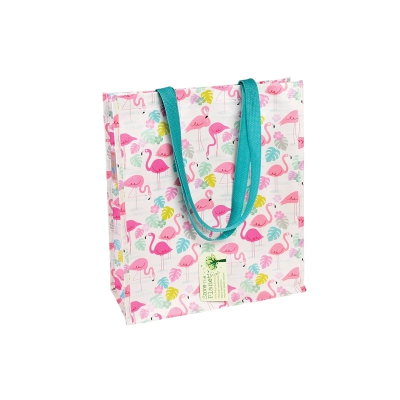 Je suis un ravissant sac cabas pour vous accompagner dans toutes vos promenades et moments shopping. Joliment décoré de flamants roses, je suis fabriqué à partir de bouteilles en plastique recyclées dont les poignées solides sont fabriquées en nylon. On me plie facilement pour faciliter le rangement d’objets et je supporte de lourdes charges.